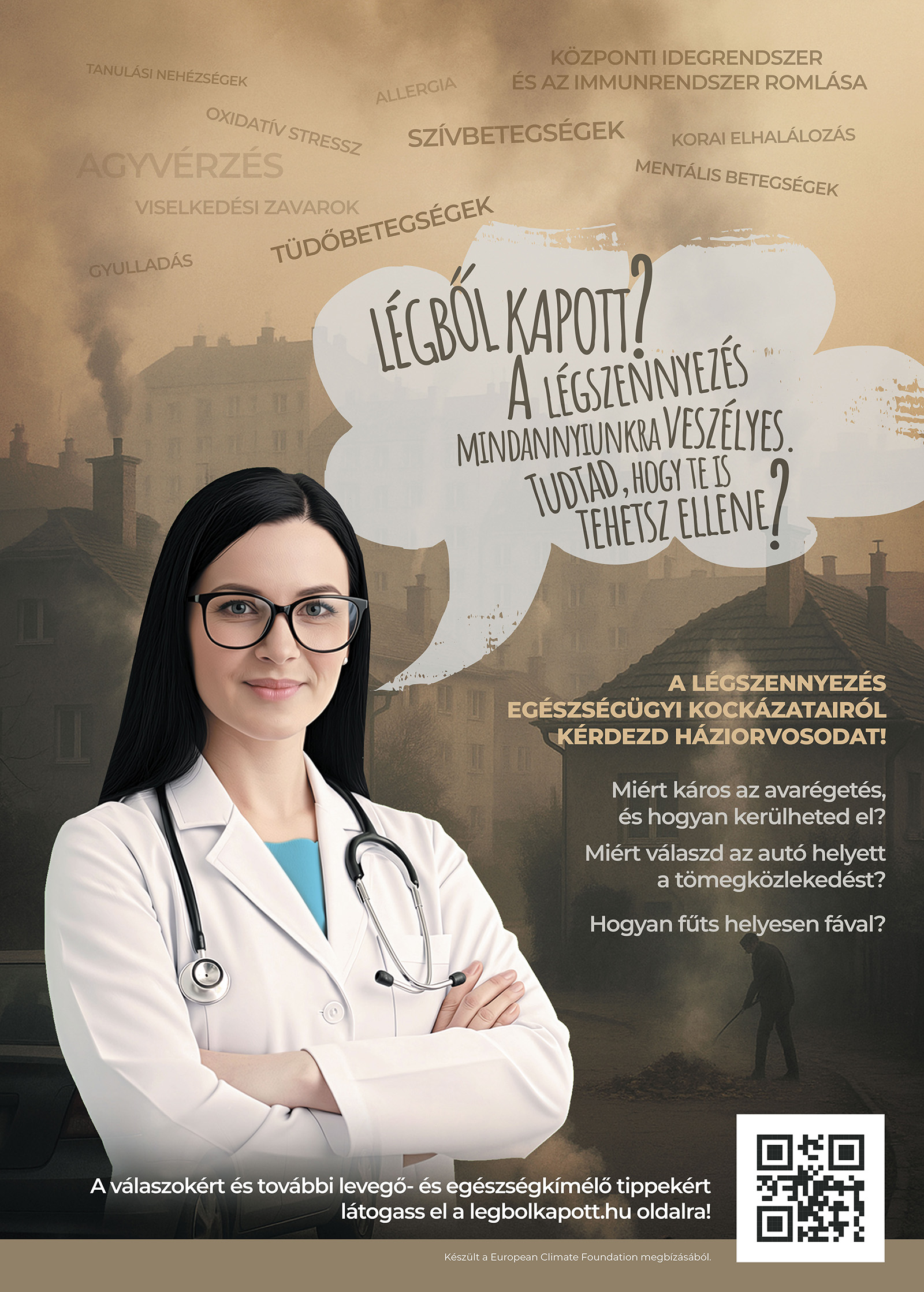 Októberben és novemberben országszerte 300 orvosi váróteremben találkozhatnak a Légből kapott? — A légszennyezés helyi veszélyei és orvoslása kampány plakátjával, melynek célja, hogy felhívja a páciensek figyelmét arra, egészségi állapotukat nagyban befolyásolhatja a légszennyezés. Több szennyezőanyag esetén maga a lakosság a legfőbb kibocsátó, így saját cselekedeteiken is múlik a levegőminőség, és általa saját egészségük megóvása. Ezt az állítást pedig leginkább Önök tudják hitelesíteni a páciensek szemében. Ezért köszönjük, ha betegeik figyelmébe ajánlják a légszennyezés témakörét és a legbolkapott.hu oldalon megtalálható egyéni cselekvési lehetőségeket!